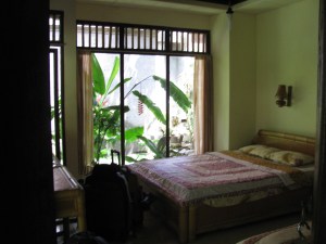 She brings me to an enormous room with a kitchen a king bed. She smiles and says 300,000 ( a little more than $30 a night). I shake my head and say we can only pay 150,000. She frowns and brings me to a new room a cross the way that is smaller but still clean, cool, and with light coming in on all sides. She tells me 200,000. I sigh and say 150k. She puts her finger to her lips and says, “this good deal you no tell other guests it should be 250…so we 200 yah” I try again – we’ll stay for 180. She shakes her head no. I feel the sweat flowing down my neck and agree, and go to find Tim.