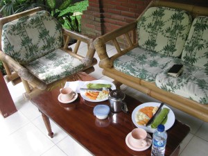 Upon return, Ketut tells us a price for our drive. We ask him a follow up question and he runs away. He comes back in 20 minutes (Tim at this point is down the street). Ketut and a new man sit down with me on the patio without being asked. The new man smokes a Marboro Red, and I do my best to give him an unapproving look, but he sits and smokes. Then he tells me his price to go to the cave. I negotiate. Tim comes back and is surprised to see me on our patio with the two men and I just shrug and explain the prices. The man’s name is Yoman. We agree we will be seeing him in the morning.