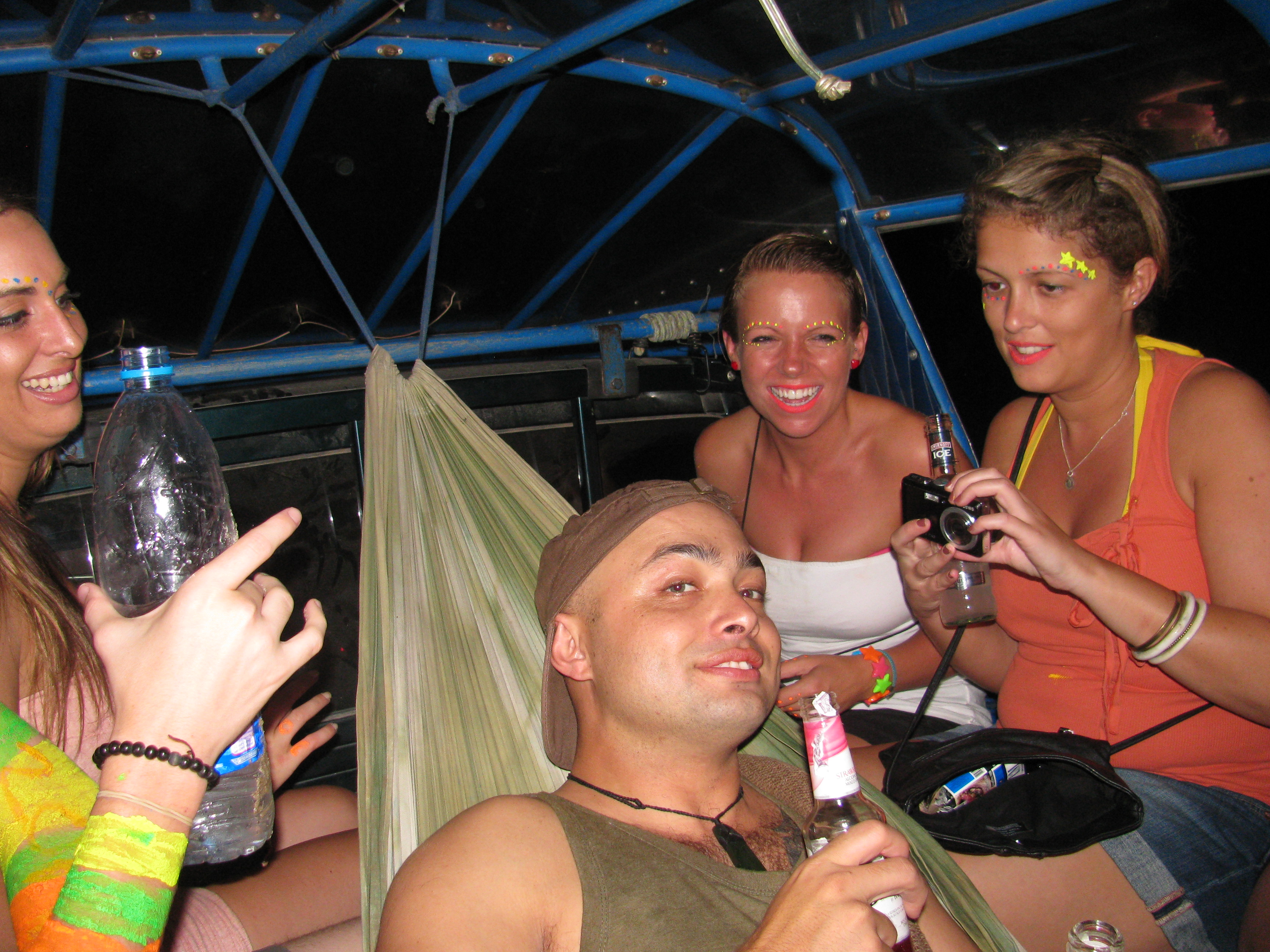 Pregaming and Painting with the Shiralea crew. We had already spent some time with a lot of the other guests at our resort. The owners had offered to order Songthaews (trucks turned into taxi) for everyone at the same time to go together. I didn’t realize it was tradition to paint yourself in blacklight paint.