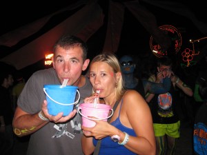 After being dropped off and walking a good ways down to The Paradise (the original full moon spot) all 30 of us have our buckets in hand and the music is good so we dance in the sand.